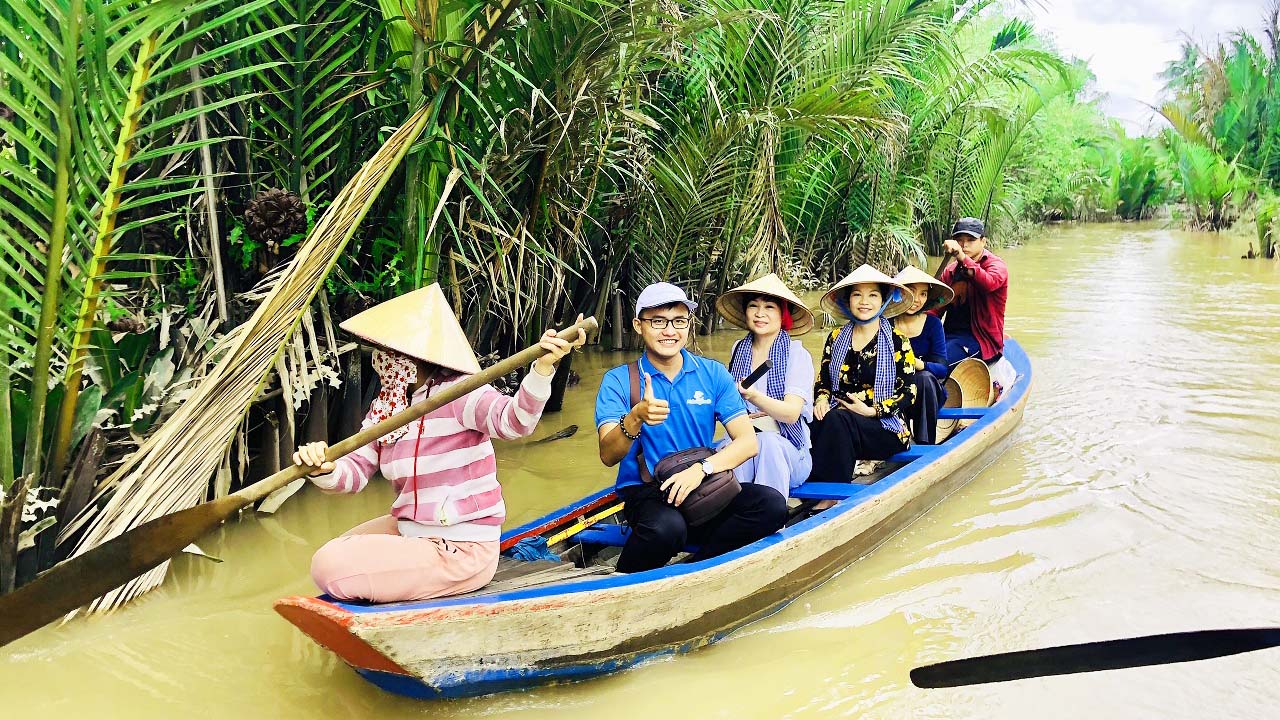 Đoàn trải nghiệm ngồi xuồng 3 lá trên rạch nhỏ dưới hai hàng dừa nước mát rượi.