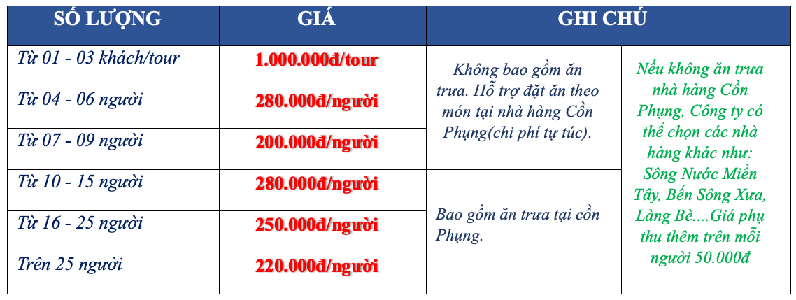 Từ 01 tuổi – dưới 05 tuổi: miễn phí. Miễn phí tối đa 2 bé/đoàn. Từ 05 đến dưới 11 tuổi: tính 75% giá tour.